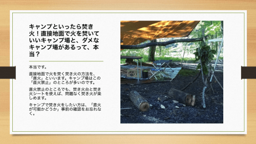2020年8月(緊急事態宣言解除後)、2021年5月に、「コロナ禍におけるキャンプ」とテーマを決め、実際に活動を行いました。今までとは違うキャンプ場の風景、そして、活動を通じて、「キャンパーが意識するべき衛生管理」とは何か考えています。今回は番外編。武蔵越生高等学校では、昨年度は新型コロナウイルス感染症の流行により中止となった文化祭ですが、今年は行うことができました。その中で、アウトドア部は初の出展を実現しました。その時の模様を、少しだけお届けします。