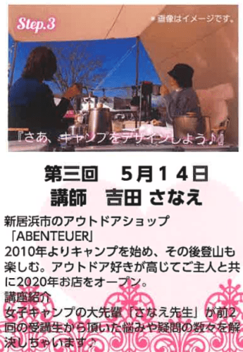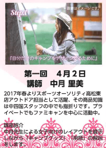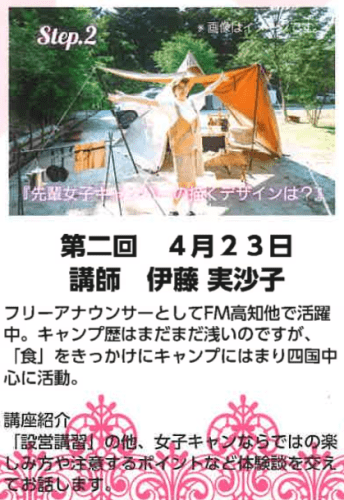 - 基本的なキャンプ用語、キャンプ用品の解説を、アウトドア用品を常に扱っている売り手の観点から。そして、女性キャンパーであるご自身の視点から、インスタ映えする女子向けのレイアウトを初心者様にお伝えしていただきます。