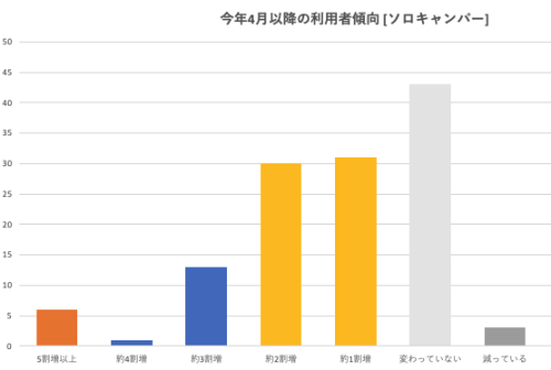7月中旬までの予約状況では秋冬の同様の調査と比較して、いづれも20ポイント近くアップしている。「新たにオンライン予約をはじめた」「予約をオンラインのみにした」というキャンプ場の報告を多く耳にする。楽天トラベルキャンプの参入もはじまったことから、予約サイト間のサービス競争拡大で今後さらにこの比率は伸びると予想される。