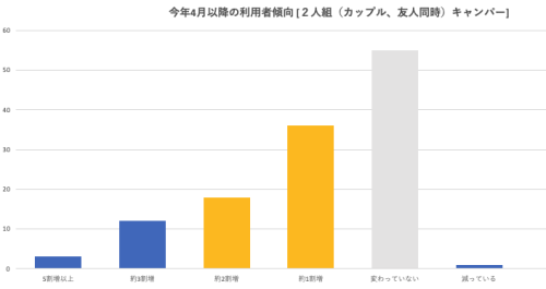 前回の秋冬調査時と比較して業績回復見通しの明るくなったという回答が、昨対・対コロナ前いづれも微増する結果となった。2回、3回のワクチン接種が全国民に進んだこと、「雪中キャンプ」を新たにはじめるキャンプ場が増えたことが要因にあると考えられる。
