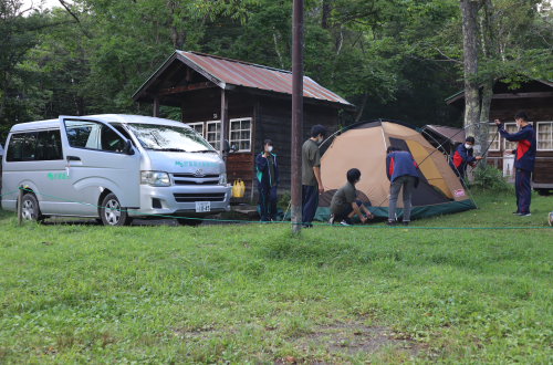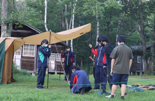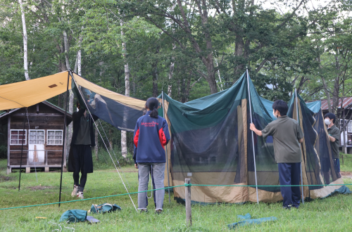 戸隠キャンプ場は大規模な区画サイトなどもありますが、バンガロー、ログキャビン、コテージなどの宿泊施設も多数完備されています。今回は、元々あまり天気予報が良くなく、直前にバンガローに変更していたため、食事をするためのタープと先生用のテントの設営のみでしたが、テントの設営に慣れたメンバーじゃなかったため、少し時間がかかりました。私たちはバンガローに泊まりましたが、普段のテント泊とはまた違う非日常感でした。