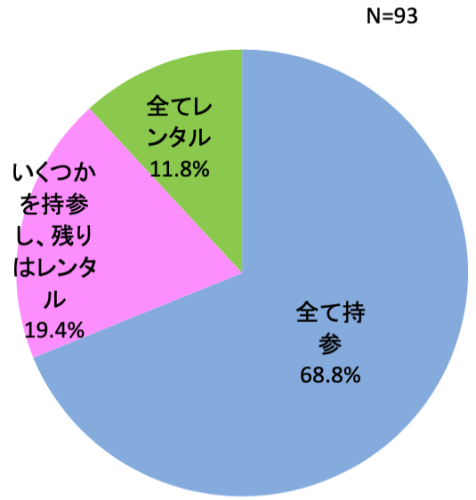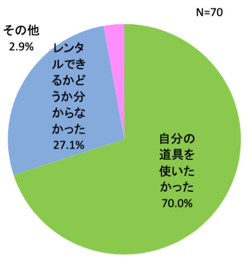 また持参した理由としては「自分の道具を使いたかった(70.0%)」が最も多く、自分の道具への思い入れが強く感じられます。ただ、「レンタルできるかどうかわからなかった(27.1%)」方がいることから、事前の情報提供も必要と考えられます。