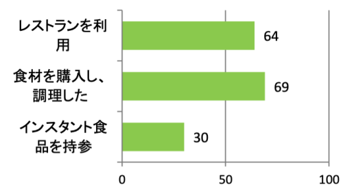 キャンプ中の食事では、「食材を購入し、調理した(69人、61.0%)」が最も多く、「レストランを利用(64人、56.0%)」が続いています。中には「インスタント食品を持参(30人、36.0%)」するキャンパーもいるようです。あまり知られていませんが、台湾では宗教上の理由もあり、いわゆるベジタリアン(菜食主義者)の割合が高いこともあり、本来自炊が基本のキャンプ活動は相性がよいのかもしれません。ですから一般の台湾人観光客にとっても好きな食材を選べるコンビニは重宝されているようです。
