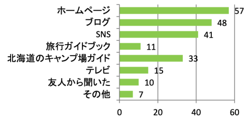 本オートキャンプ場の認知や情報入手方法ではインターネットによるものが大半を占めています。「ホームページ(57人、50.0%)」が最も多く、「ブログ(48人、42.0%)」、「SNS(41人、36.0%)」が続いています。一方「北海道のキャンプ場ガイド(日本語)(33人、29.0%)」も多く、北海道でのキャンプに対する関心の高さが伺えます。