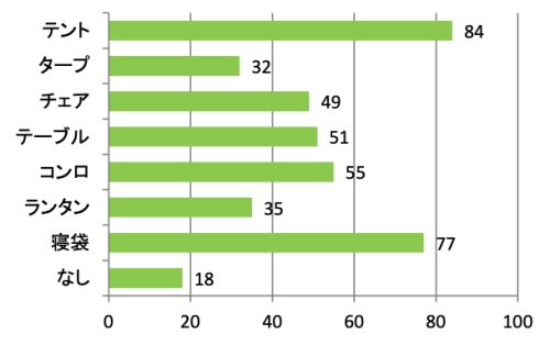 利用したキャンプ用品は「テント(84人,74.3%)」が最も多く、「寝袋(77人,68.11%)」が続いています。また利用キャンプ用品の手配方法では「すべて持参(68.8%)」、「持参+レンタル(19.4%)」で、「すべてレンタル(11.8%)」であり、基本的には持参しているキャンパーが大半です。持参用品はテントと寝袋を中心にテーブル・チェアといったファニチャー類を持参してくる者も少なからずいるようでした。
