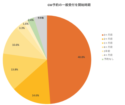 3ヶ月前予約受付開始が約半数となっている。2ヶ月前と1ヶ月前予約を合わせると約4分の3を占める結果となった。