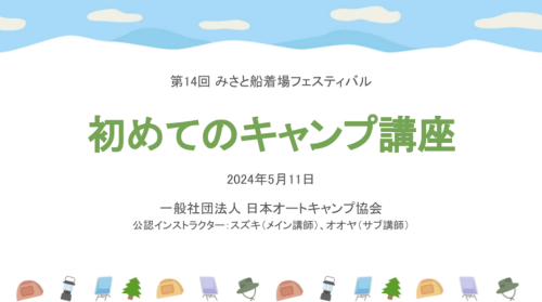 最初は「初キャンプ講習」として、用意した資料をもとに15分程度で座学を行いました。