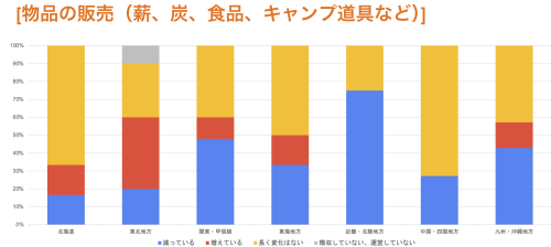 回答キャンプ場の約2割が「物品販売」の強化に収入拡大の活路を見出そうとし、「法人取引」「アクティビティ」「日帰りキャンプ」に約1割前後のキャンプ場が収入拡大に力を入れていくと回答している。
