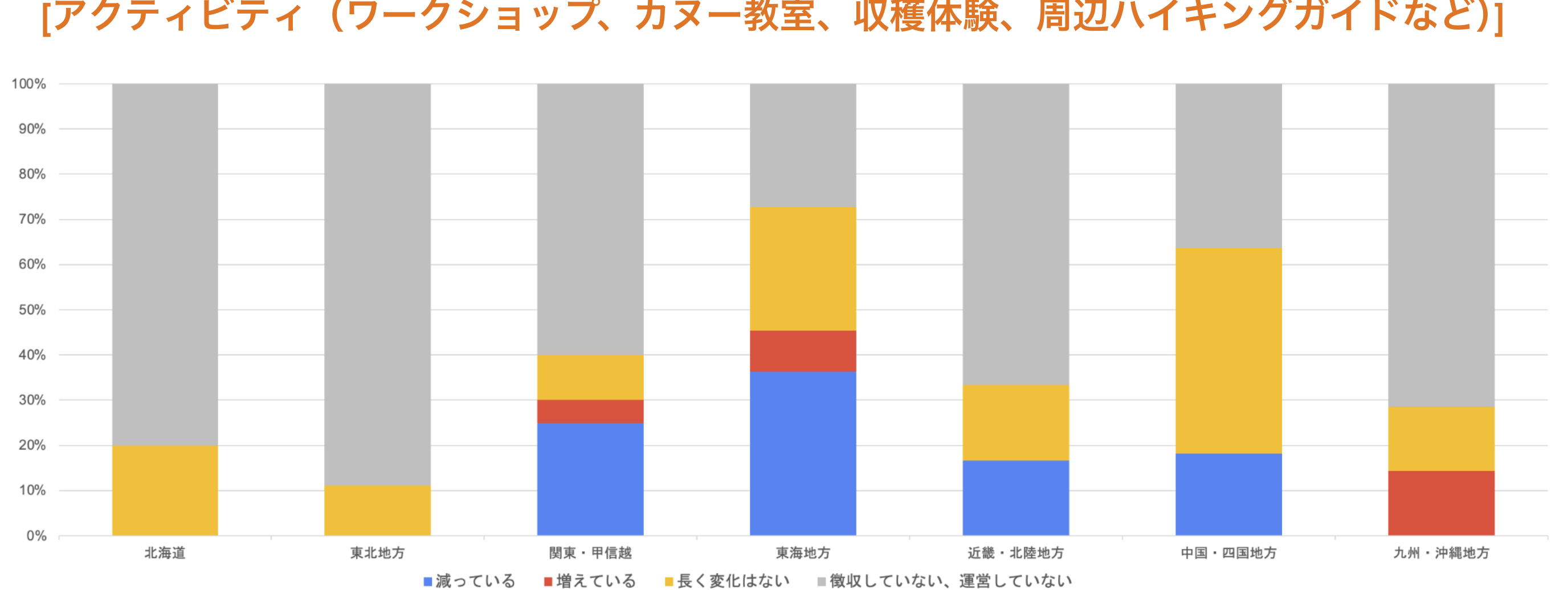 林間学校や合宿などの利用も受け入れやすいと想像される公設キャンプ場では、回答の約15%が法人や団体利用の売上が全体の1割以上を占めているとの回答だった。民営では約7割が全体売上の1%に満たないという回答結果だった。