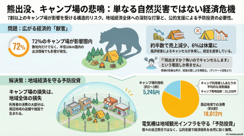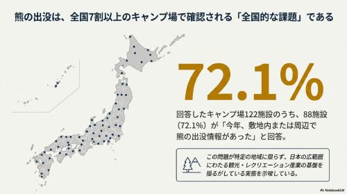 熊出没は、特定の地域や一部のキャンプ場だけの問題ではありません。今回の調査結果が示しているのは、
