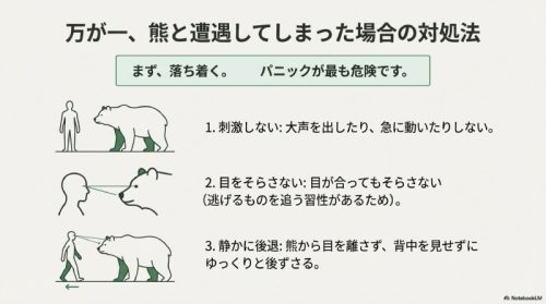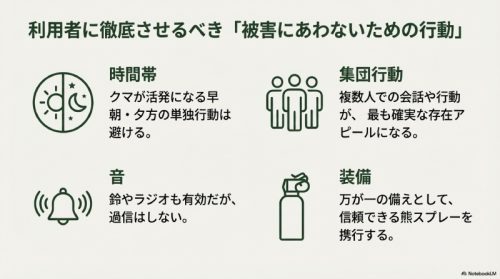 クマ出没が強く懸念されるエリアにおいては、利用者への具体的な行動指示を明確に伝えることが求められます。