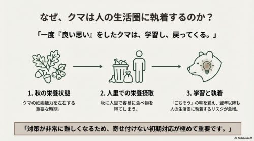 つまり、秋に人里で食べ物を得てしまった熊は、翌年以降も人の生活圏に執着するリスクが高まるということです。