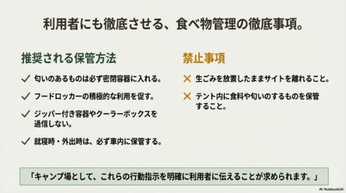 - フードロッカー、ジッパー付き容器、車内での保管を徹底