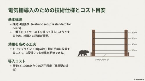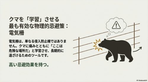 電気柵は、熊に「ここは危険だ」と学習させる忌避効果が高いとされています。