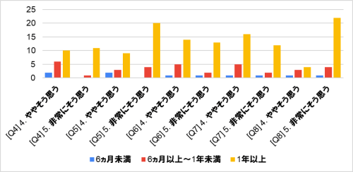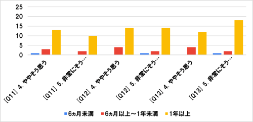 まず、5点法で回答した項目について、それぞれ活動歴1年未満の生徒と1年以上の生徒で平均値を取って、そのスコアの差を調べた。それぞれ統計的な有意差は認められなかったものの、平均値を見ると「在籍期間が長いほど、自己評価が高くなる」という明確な傾向が確認された。特に「Q5 仲間と協力して行動できるようになった」は、統計的にも有意な差が出る一歩手前まで来たといってもいいだろう。
